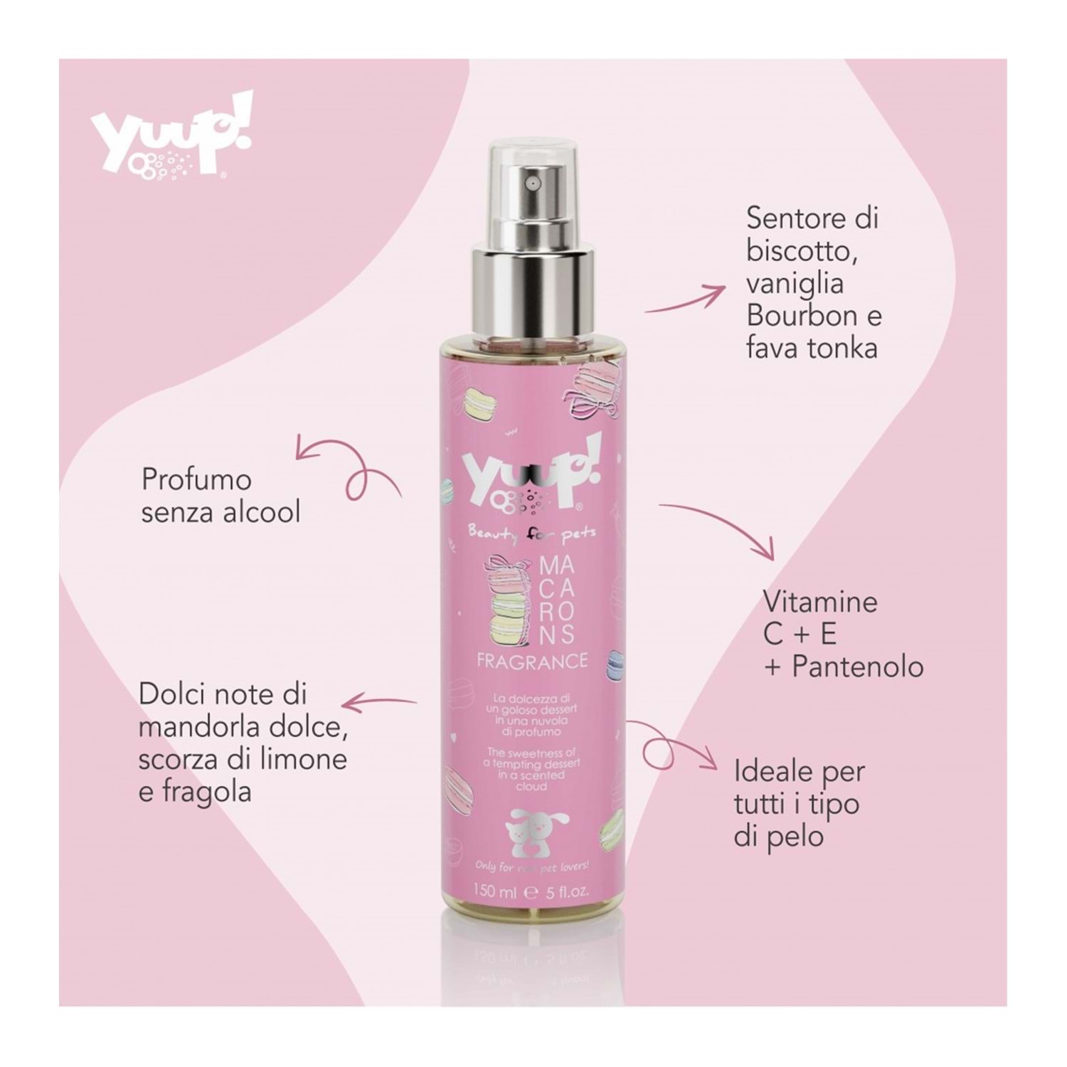 Macarons Fragrance Yuup!, dört ayaklı dostlarımızın bakımı için idealdir. Sadece harici kullanım içindir. Yalnızca sağlıklı ciltte kullanın.